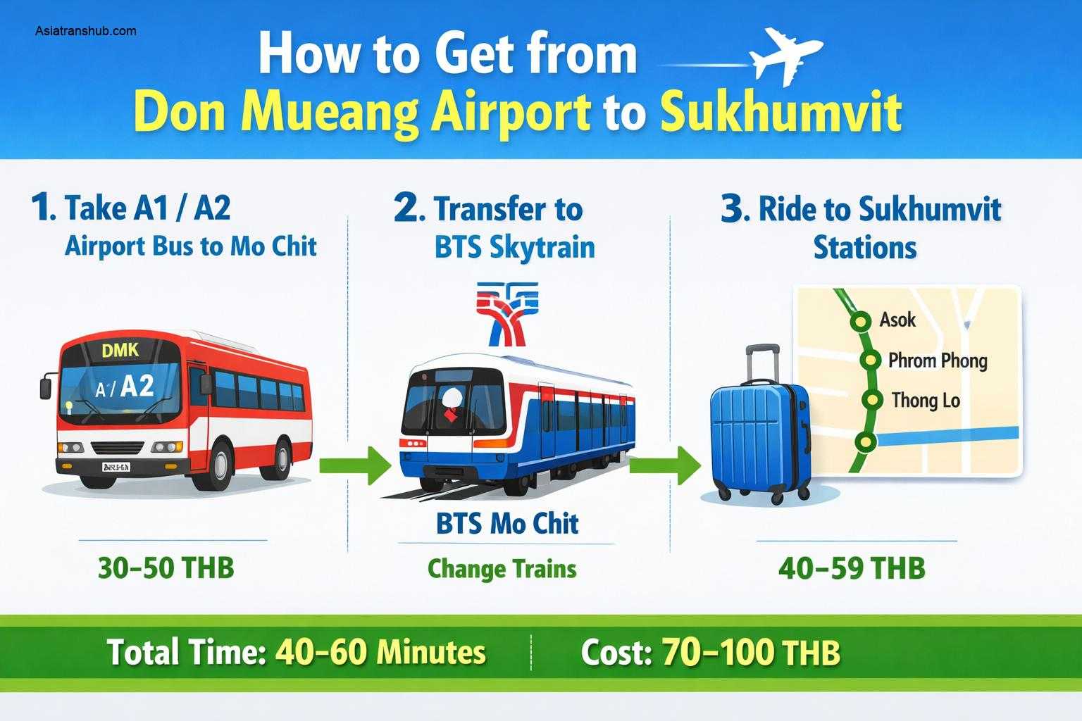 Ride to Krung Thep Aphiwat (formerly Bang Sue Grand Station). Follow “MRT Blue Line” signs inside the station. Buy an MRT ticket (฿25-40) to Sukhumvit station. Exit at Sukhumvit and you’re connected to BTS Asok for onward travel along Sukhumvit Road.