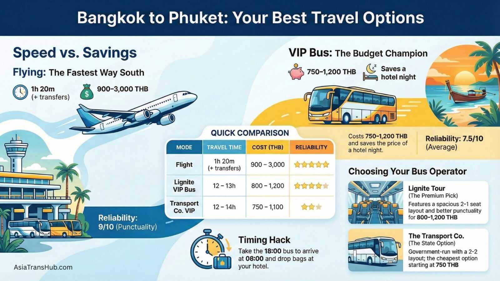 Flight wins on speed and reliability (score 9/10). Bus wins on price and convenience if you’re already at Sai Tai Mai. Lignite edges out Transport Co. for seat comfort and punctuality.