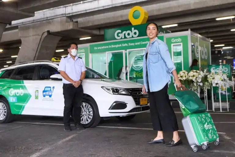 Grab or Bolt? Open app, set pickup at Level 1 designated zone. Confirm driver photo and plate. Standard sedan trunk fits two large bags max. Surge pricing hits 1.5x-1.8x during peak hours. Sunday 6 PM departure once cost 1,450 THB.