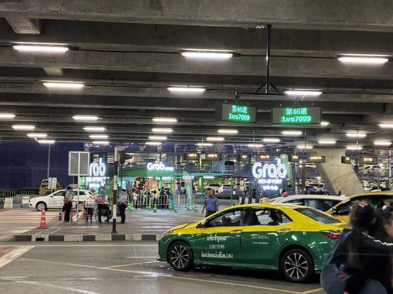 Grab/Bolt: Buy a SIM card at Arrivals kiosks (฿299 for 15 days unlimited). Open app. Set pickup at designated ride-hailing zone (app shows exact spot). Standard car costs ฿300-380 off-peak. Surge pricing hits ฿450-600 during evening rush or rain. Driver calls if confused. Pickup zones shift between Level 2 and Level 4 depending on airport traffic flow. Check app instructions carefully.
